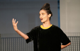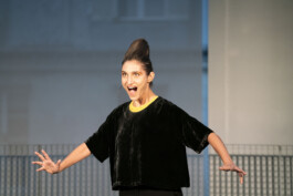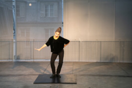 Dans le solo GESÄCHT, Flora Détraz incarne une sorte de cantatrice loufoque, en proie à un duel haletant entre la voix et le corps. Sommairement munie d’un plateau en bois qu’elle prend pour un plateau d’opéra, elle joue avec les codes de la représentation : entrée sur scène, salut d’un pianiste imaginaire, climax lyrique, salut d’un public, rappel.